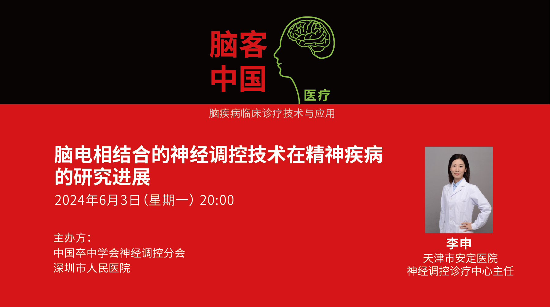 腦客中國·醫療2024年卒中及神經系統疾病臨床診療新技術講壇無創腦神經調控第7期專家:天津市安定醫院神經調控診療中心主任,李申教授。6月3日20:00,歡迎參加!