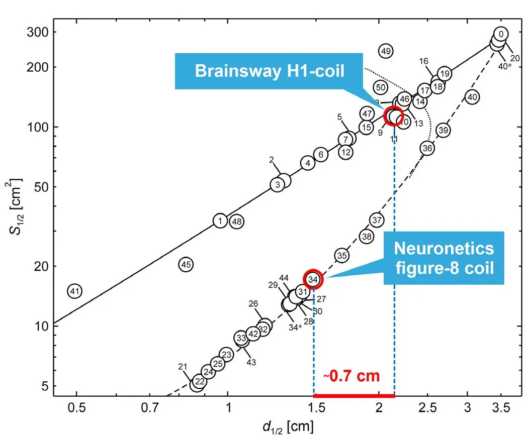 ▲H1線圈和8字形線圈感應(yīng)的電場分布圖,基于在充滿生理鹽水溶液的模型頭中的測量結(jié)果。紅色像素表示高于神經(jīng)元激活閾值(100V/m)的電場幅度。以120%閾值強度刺激時,H1線圈在1.8厘米深度處誘導(dǎo)超閾值電場,而8字形線圈可誘發(fā)超閾值電場的深度僅為0.7厘米。