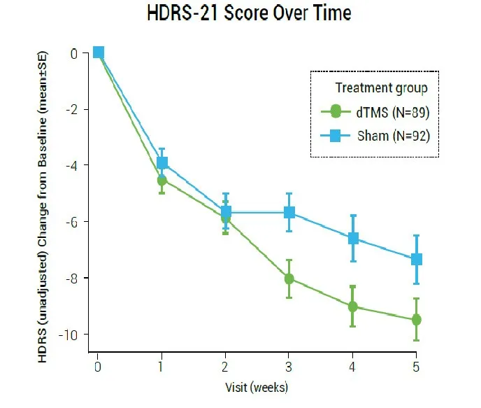 來自以色列、德國、美國、加拿大等國家的研究者開展了首項全球多中心雙盲對照研究,并發(fā)表于權(quán)威精神病學(xué)期刊《世界精神病學(xué)》。該研究于全球20個中心開展,共納入了233名抑郁癥患者,在4周的急性期治療內(nèi)接受了20次dTMS治療,研究主要療效終點為21項漢密爾頓抑郁量表(HDRS-21)總分自基線至第5周的變化情況,次要療效終點為第5周時的有效/治愈率。