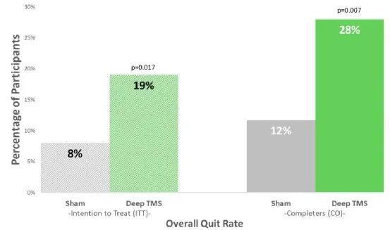 該研究針對H4 線圈進行一項前瞻性、雙盲、隨機、假對照臨床研究,證明了H4 DTMS系統(tǒng)具有有效輔助煙癮患者短期戒煙的效果。試驗納入多中心262名患者(患者對吸煙高度上癮,平均吸煙史超過26年,并且多次嘗試戒煙失敗),隨機分為兩組:試驗組,和設(shè)有一個假(安慰劑)對照組。治療每天進行,每周5天,持續(xù)3周,然后每周額外進行3次療程,持續(xù)3周(6周內(nèi)共18次療程)。