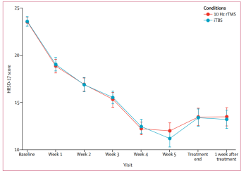 2018年,世界頂級期刊柳葉刀(Lancet)雜志發(fā)表了一項TMS針對來自三家加拿大醫(yī)院的414名難治性抑郁癥病人的治療效果,并給予了兩種治療方案:10Hz高頻和iTBS方案,在為期一個月的治療后,病人的抑郁癥狀有了明顯改善,后經(jīng)3個月的隨訪也證實了TMS治療的長期有效性[1]。