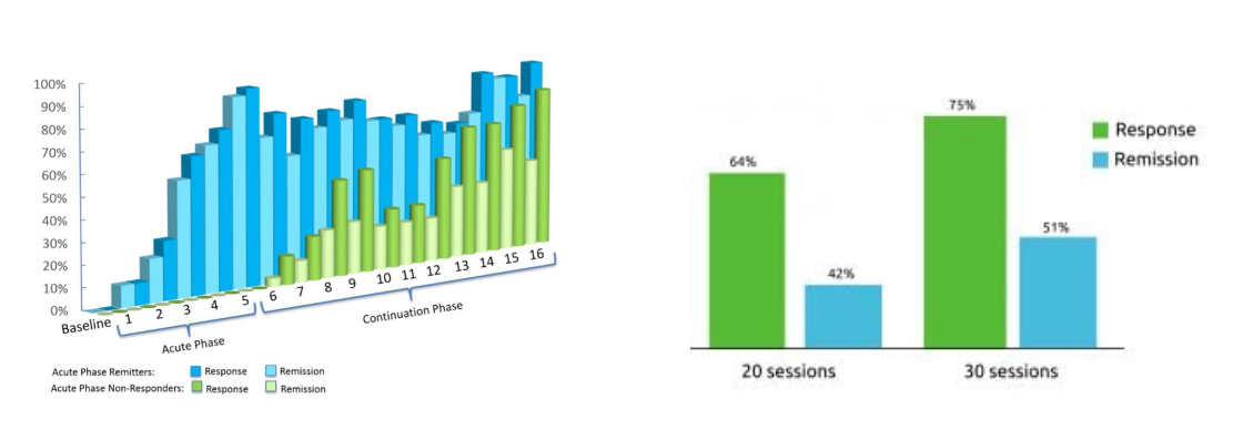 2015年,世界精神病學(xué)(World Psychiatry)上發(fā)表了一項來自20個多中心212名的難治性抑郁癥病人的臨床數(shù)據(jù),評估了DTMS在難治性抑郁癥治療的臨床效應(yīng)。治療方案選用FDA批準(zhǔn)的DTMS方案,在經(jīng)過一個療程的治療后(20次,4周),超過1/3之一的患者病情緩解,經(jīng)過30次治療后,緩解率達(dá)到了51%,反應(yīng)率高達(dá)75%[2]。